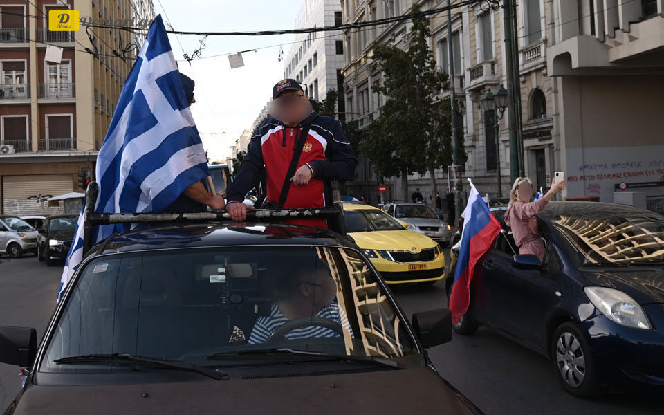 ولوح المتظاهرون في موكب سيارات يوم الأحد بالأعلام اليونانية والروسية وأطلقوا أبواق سياراتهم أثناء مرورهم في ساحة سينتاجما التي كانت تستضيف في ذلك الوقت مسيرة مؤيدة لأوكرانيا. شوهدت بعض المركبات مزينة بشعار “Z” الذي يُنظر إليه على أنه يرمز إلى دعم الحرب الروسية في أوكرانيا.