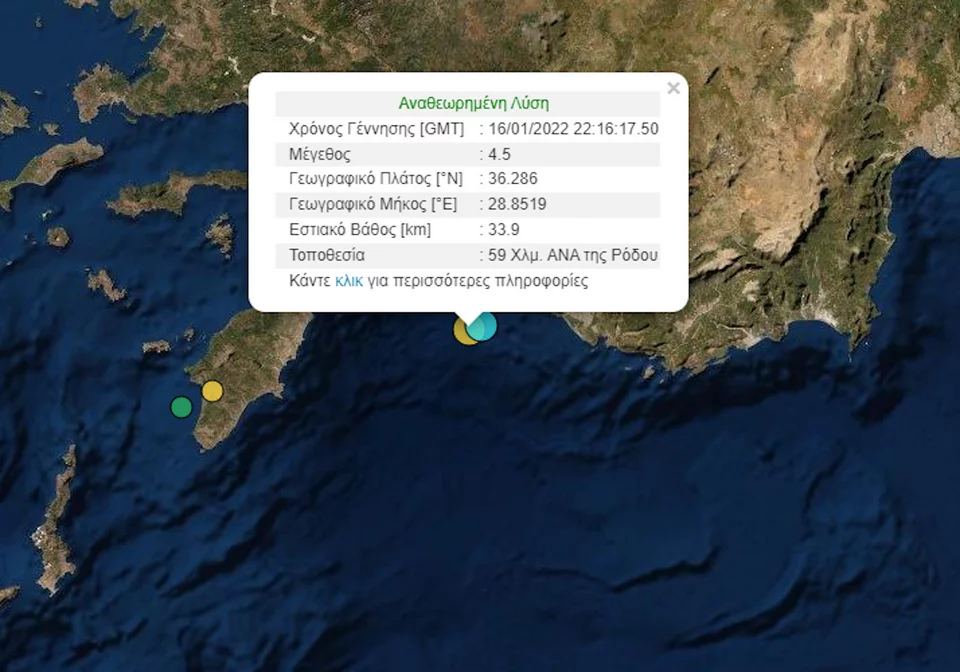 كما تم تسجيل زلزال آخر بعد ثوان قليلة في نفس المنطقة ، بقوة 4.5 ريختر ، 59 كم شرق / جنوب شرق رودس وبعمق بؤري 33.9 كم.