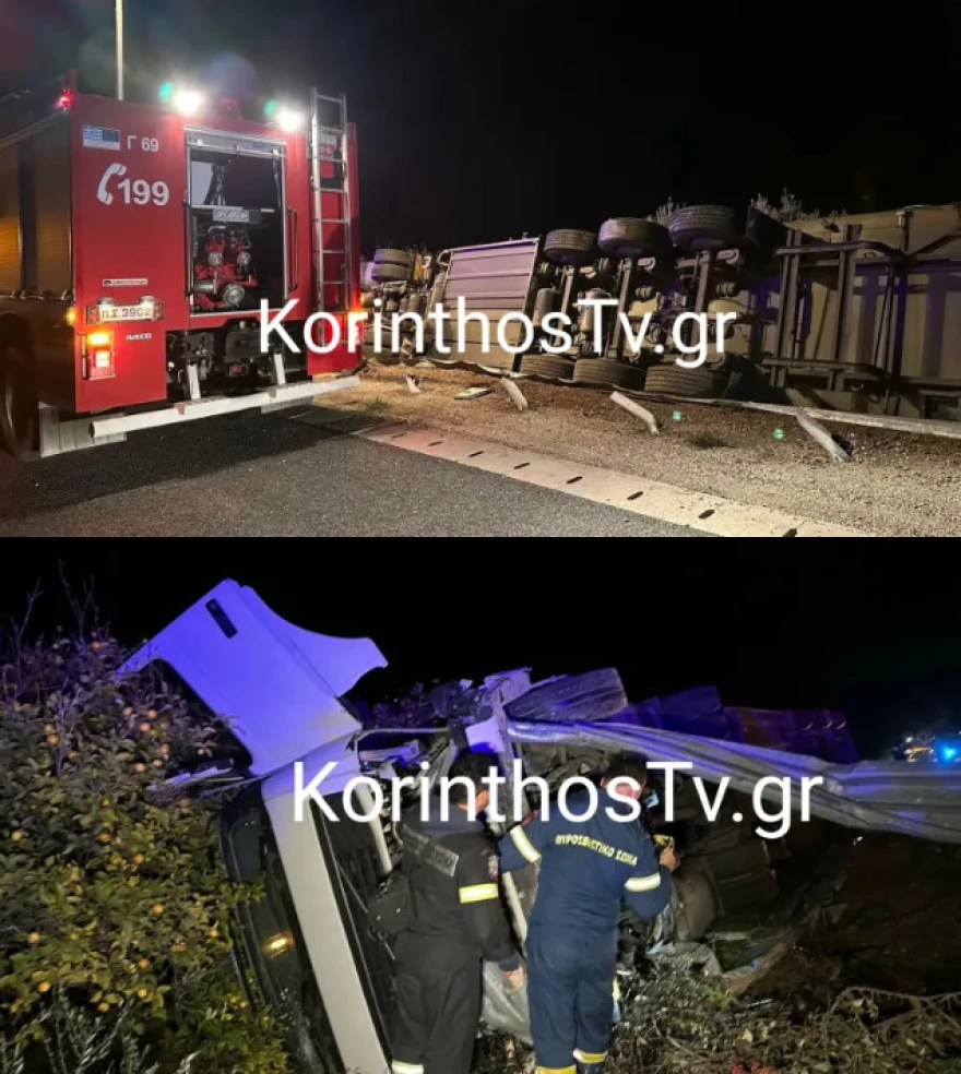حادث خطير على طريق أثينا باتراس انقلاب شاحنة واستنفار فرق الإطفاء