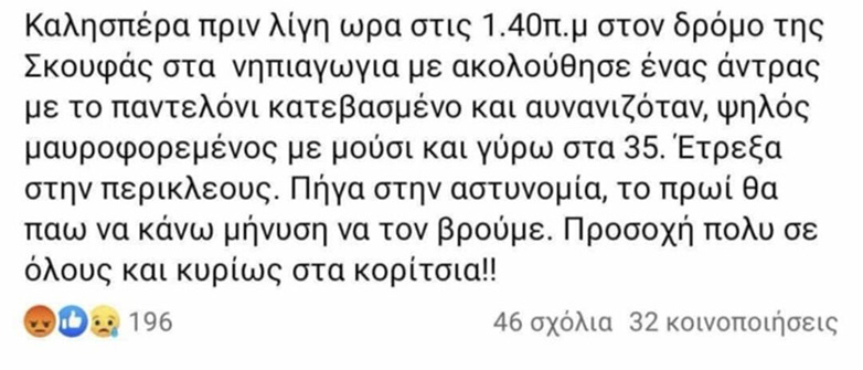 مساء الخير في تمام الساعة 1:40 صباحا بشارع سكوفة قرب روضة أطفال تعرضت لمطاردة من رجل طويل القامة أسود البشرة وله لحية وكان يمارس العادة السرية. هربت إلى شارع بيريكليوس وقدمت بلاغا للشرطة وسأقوم صباحا بتسجيل شكوى رسمية. كونوا حذرين خاصة الفتيات!